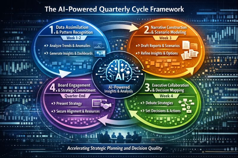 4. Board Engagement and Strategic Commitment (Quarter-End): The agent provides insight logs, confidence-rated forecasts, and documented decision rationale. Leadership presents strategy, engages board questions, and secures alignment and resources. The final board packet, approved strategy, and resource allocation emerge from this stage.
