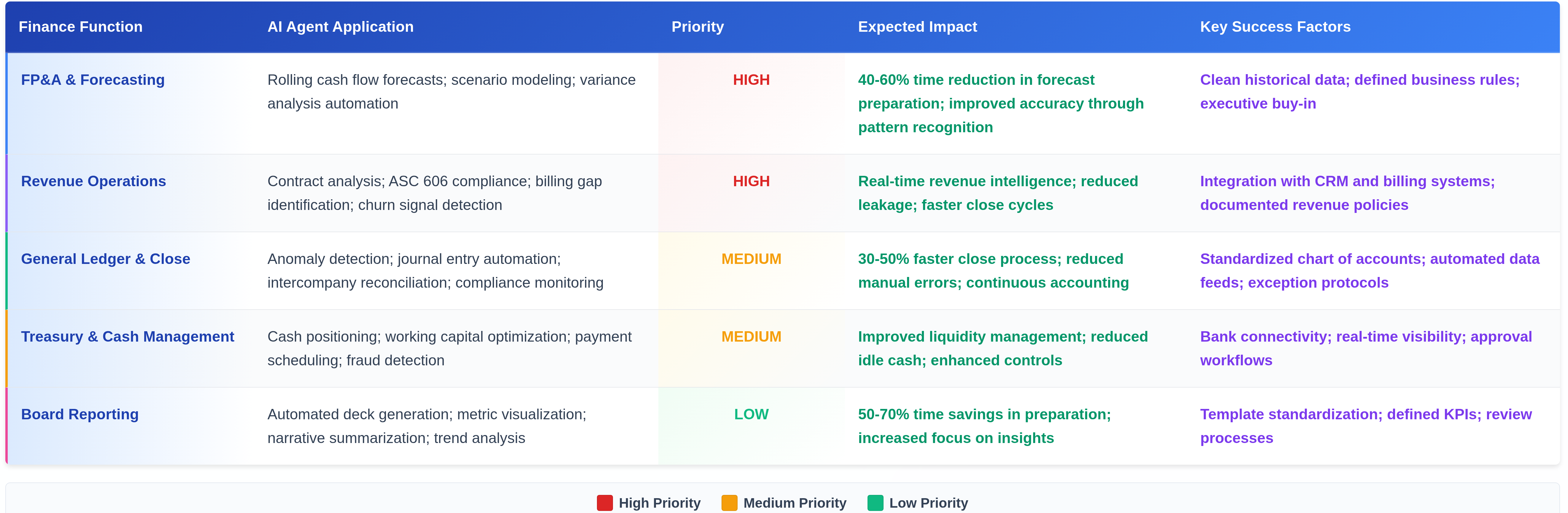 The following framework outlines a practical approach for integrating AI agents across core finance functions based on implementation experience across cybersecurity, SaaS, digital marketing, and nonprofit organizations: