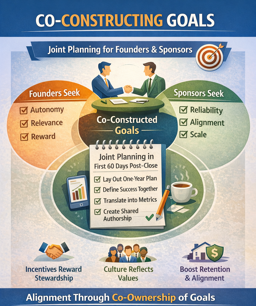 To design better systems, founders seek autonomy, relevance, and reward. Sponsors seek reliability, alignment, and scale. The intersection lies in co-constructed goals. I advocate for joint planning sessions during the first 60 days post-close: