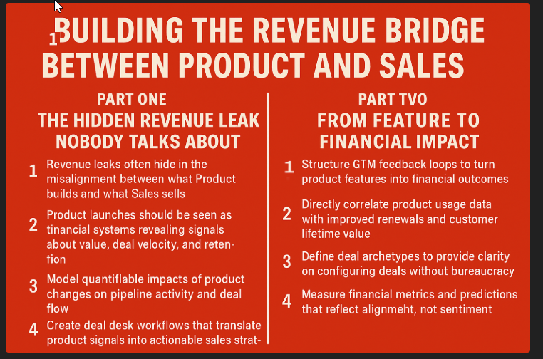 Drawing from my 25+ years across public and private companies, extensive audit experience, and M&A transactions, I have watched Product and Sales teams co-design GTM motions, co-own backlog priorities, and co-deliver customer outcomes. That partnership rarely happens organically. It must be engineered.