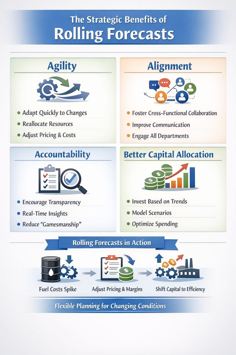 Fourth, better capital allocation. When forecasts are dynamic, capital decisions can be too. Instead of approving a full-year spend in January, investments can be staged based on evolving performance. Scenario modeling becomes easier. The CFO can model what happens if we increase headcount by 10 percent in the fourth quarter, what if we delay that capital expenditure project by two quarters, what if pricing increases drive 5 percent churn. Rolling forecasts enable that level of analysis.