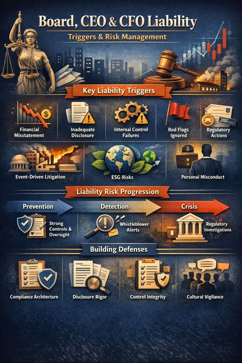 The authority of a board, CEO, or CFO is matched only by its vulnerability. Legal liability spanning civil, regulatory, and criminal domains casts a shadow across every strategic decision, public statement, and control failure. In an environment of heightened regulatory scrutiny, activist enforcement, and stakeholder expectation, understanding the liability landscape is no longer a legal function but a strategic imperative. At the core lies fiduciary duty: directors owe care and loyalty to the corporation and shareholders, while CEOs and CFOs, as operational fiduciaries, bear personal consequences for breaches through negligence, recklessness, or concealment. The liability structure is layered, from federal securities law under Section 10(b) of the Securities Exchange Act to Sarbanes-Oxley certification requirements that trigger strict liability regardless of intent. Eight primary triggers elevate routine governance into personal risk: financial misstatement, inadequate disclosure, failure of internal controls, red-flag neglect, enforcement escalation, event-driven litigation, ESG-related exposure, and personal conduct violations. The defense against liability is not reaction but structure, built through compliance architecture that maps every intersection of law and behavior, disclosure rigor that ensures coherence between statements and reality, control integrity that defines ownership at every point, and cultural vigilance that models truth-telling without fear. When liability crises occur, disciplined response requires clear roles, immediate framework activation, and measured communication that balances accountability with restraint. Real governance begins not with prevention or response but with what happens after the reckoning, turning failure into foresight and vulnerability into credibility through institutional learning and systematic reform.