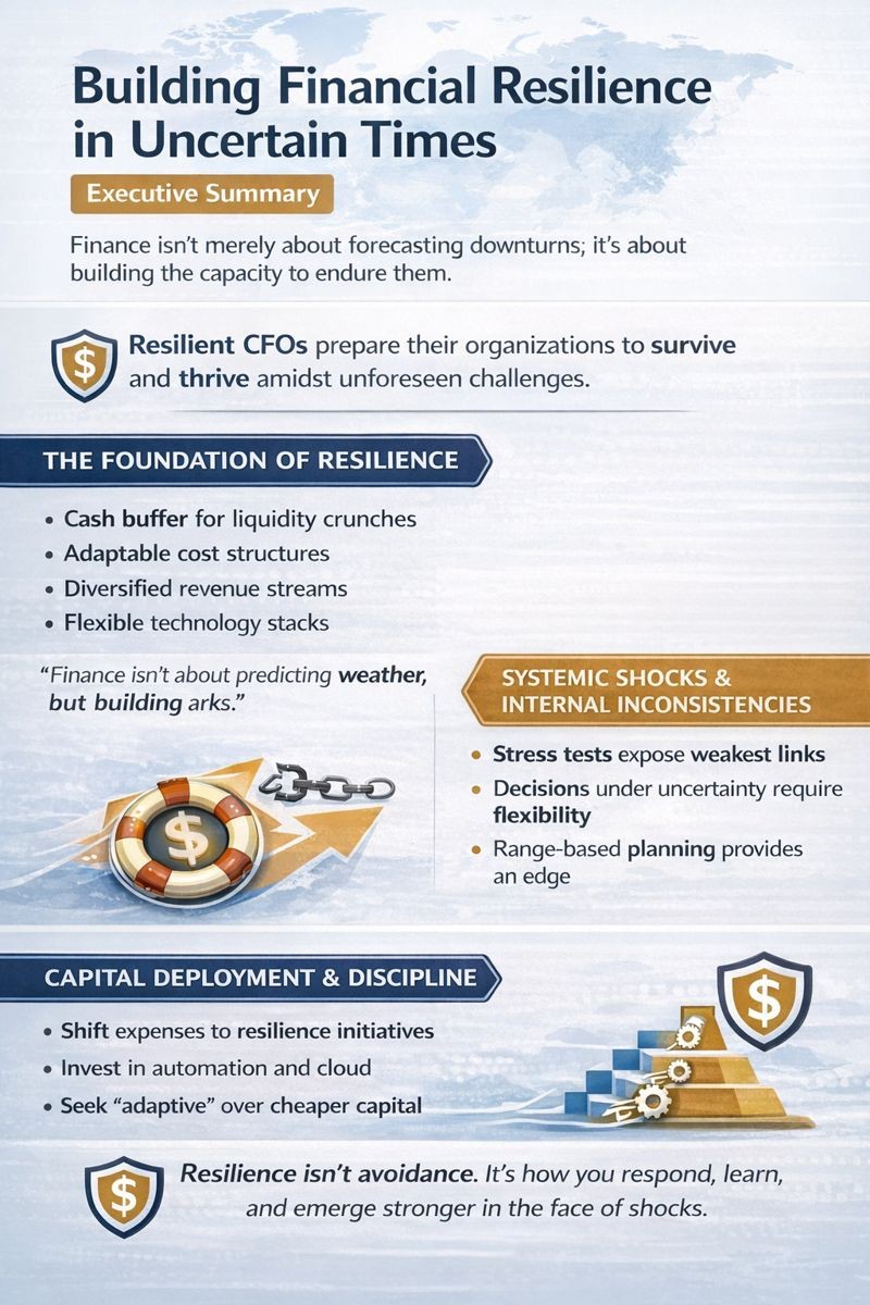 Because when the world breaks, your job is not just to hold the line. It is to ensure that when the dust settles, your company stands taller than before. Resilience is not found in avoiding shocks. It is found in how you respond to them, learn from them, and emerge stronger. It is the compound interest of discipline. It is the architecture of adaptability. It is the difference between companies that survive and companies that thrive. And it begins and ends with finance. Not because finance controls everything but because finance sees everything. And in that visibility lies the power to build organizations that bend but do not break, that absorb shocks but do not shatter, that emerge from crisis not diminished but transformed. This is the mandate of the modern CFO. This is the art and science of financial resilience.