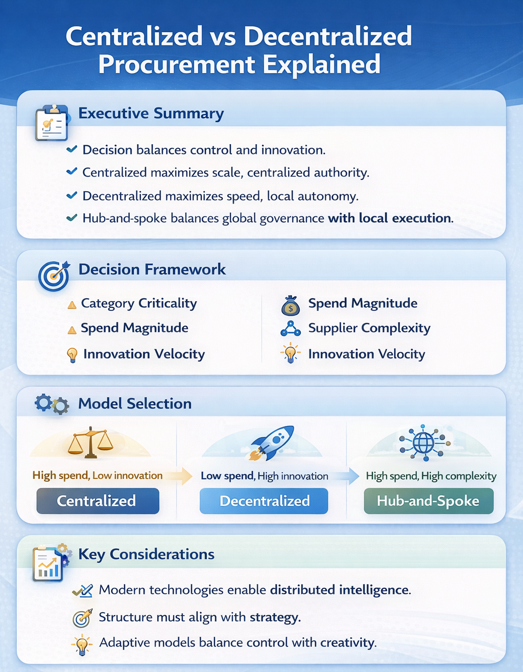 Decentralization thrives in complex, diverse portfolios where speed and local context are more valuable than scale. It works when trust is institutionalized and local leaders have capability to manage spend responsibly. But suppliers are fragmented, pricing power is diluted, data is harder to consolidate, and compliance risk increases.