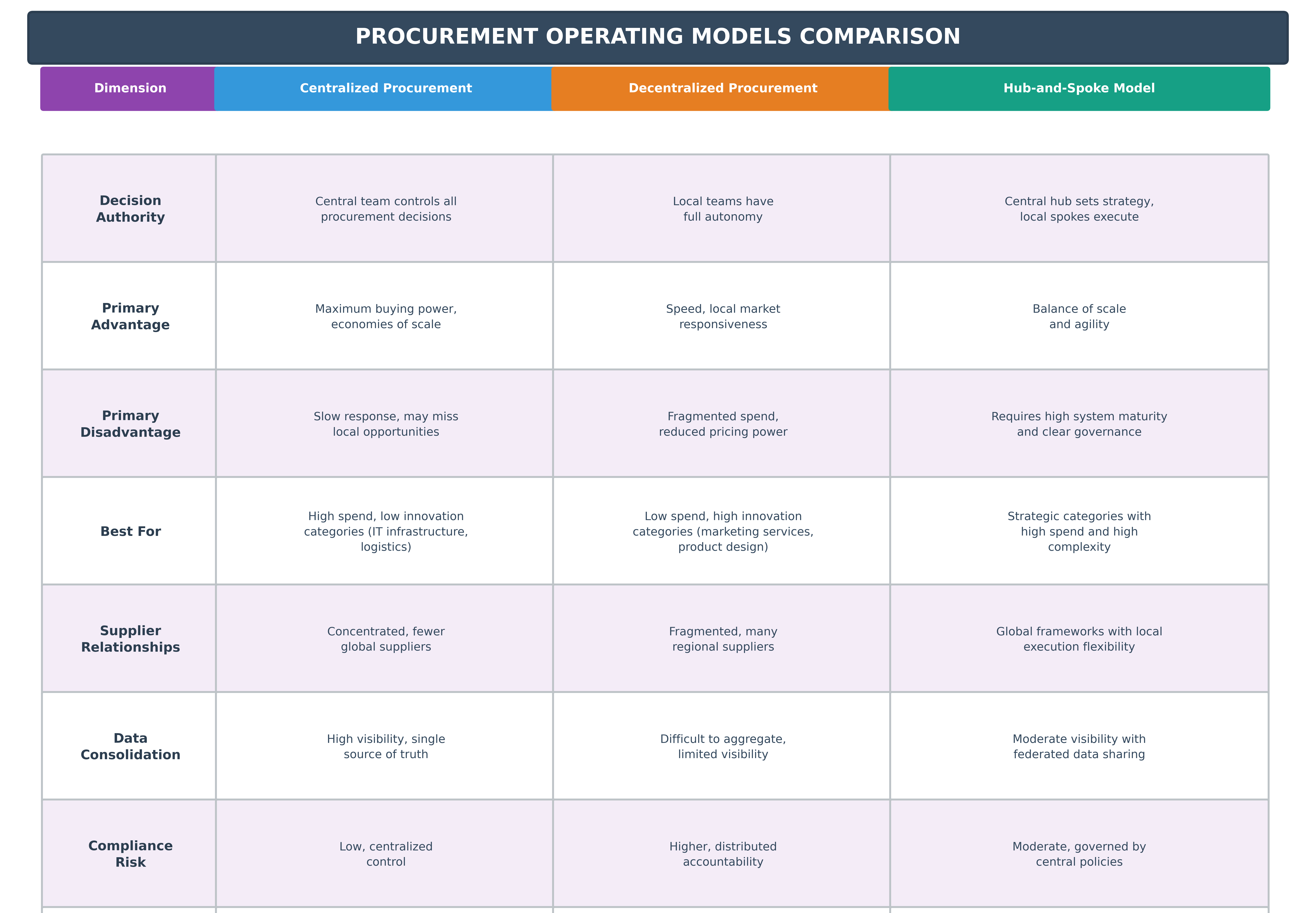 The hub-and-spoke model provides core governance, analytics, supplier contracts, and policy at the center while regional spokes execute with tailored autonomy. The idea is achieving leverage without rigidity, consistency without stagnation.