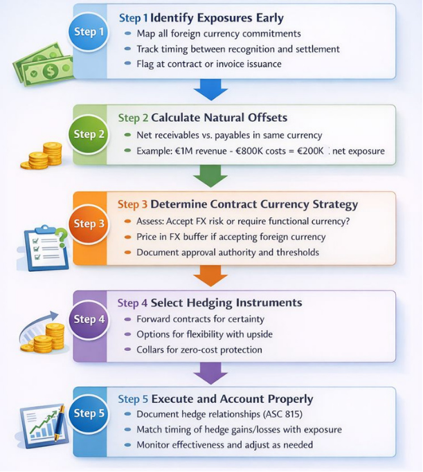 This flowchart illustrates the systematic five-step process for managing transaction exposure from identification through execution. Each step builds on the previous, ensuring comprehensive risk management aligned with business operations and accounting requirements.