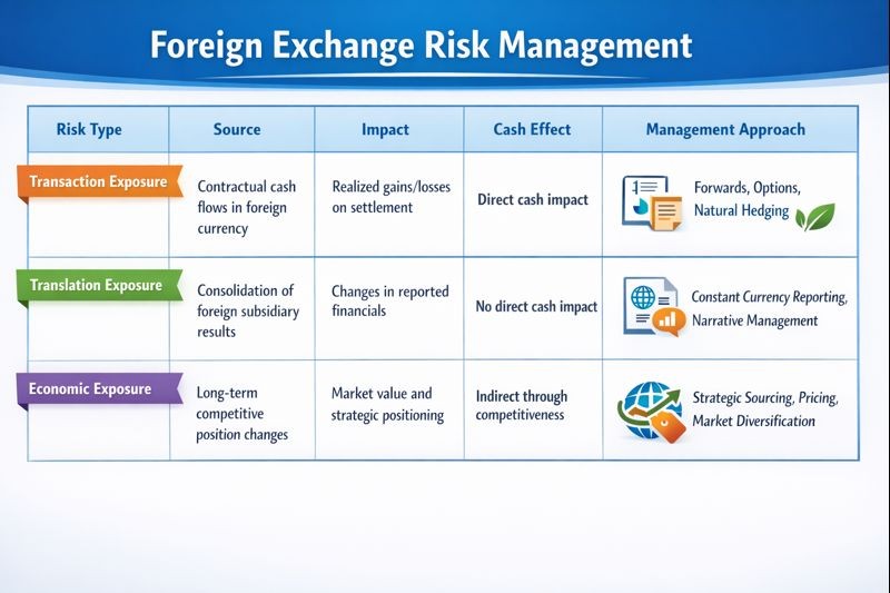 Foreign exchange risk arises because companies deal in currencies other than their functional currency, which is typically the currency of the country where the company is headquartered or conducts most of its business. Companies experience FX risk in three distinct forms, each requiring different management approaches.
