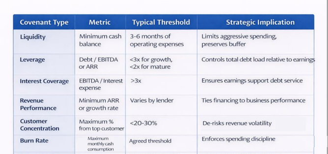 A typical term loan will involve covenants, financial ratios the company must maintain. Violating these covenants triggers a default, which could allow the lender to call the loan, increase interest rates, or impose operational restrictions. The danger is not just legal. It is reputational. A covenant breach during a growth stage can scare future investors, affect credit ratings, and trigger clawbacks on executive bonuses.