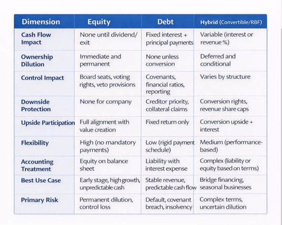 Equity is the quintessential growth capital. There is no mandatory repayment, no periodic interest, and no balance sheet liability. Instead, investors accept diluted ownership for upside participation. For early-stage businesses, raising equity is usually the simplest path. It enables experimentation, hiring, and capacity-building without the immediate pressure of revenue or cash flow.