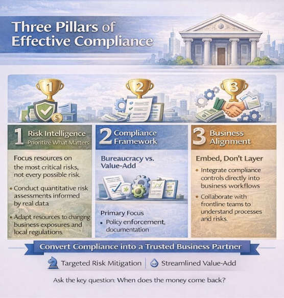 My certifications as a CPA, CMA, and CIA emphasize governance, internal controls, and compliance. But what separates effective compliance organizations from bureaucratic ones is not credential depth. It is design philosophy. Compliance functions that prioritize risk intelligence, embed themselves in business workflows, and optimize for operational simplicity become trusted partners rather than obstacles. They enable the business to move faster because they provide confidence that it is moving on solid ground.