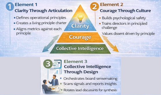 Designing a principle-based board requires three interdependent elements: clarity, courage, and collective intelligence. Clarity anchors judgment. Courage enables dissent. Collective intelligence transforms expertise into foresight. These are not philosophical aspirations. They are design requirements. They must be embedded, not assumed.