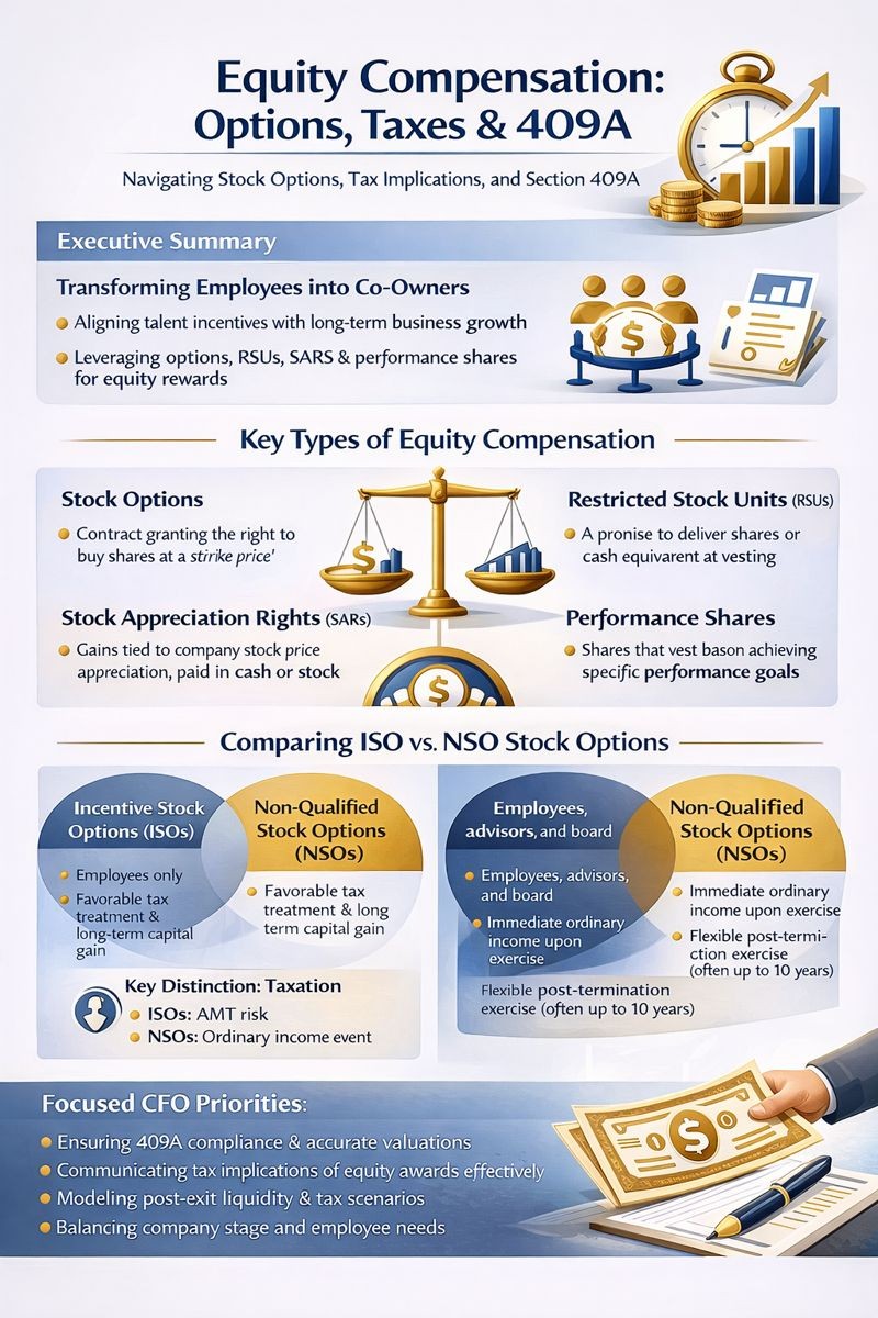 NSOs are often the instrument of choice for later-stage and public companies where liquidity is accessible and the ability to deduct compensation expenses is a strategic advantage. To maximize NSO effectiveness, CFOs should offer educational sessions, integrate modeling tools within HR portals, and provide proactive tax planning resources.