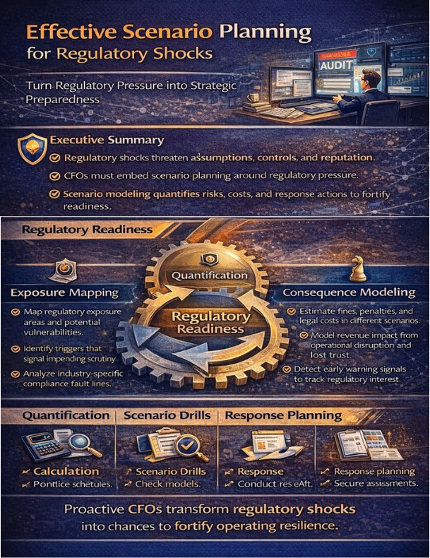 When regulators appear at your doorstep, whether in the form of a surprise inquiry, a new mandate, or whispers of impending investigation, they do not come as friends. They arrive as forces that challenge assumptions, disrupt rhythms, and publicly illuminate vulnerabilities. At that moment, your organization stands at a crossroads: will it respond reactively, hoping that nothing critical emerges, or will it lean into the uncertainty, using scenario planning not just to defend but to fortify its operating model and reputation? Finance leaders must treat regulatory shocks as more than compliance exercises. They must treat them as strategic inflection points. Because regulatory scrutiny is not random. It often signals misaligned incentives, fragile controls, emerging material risks, or inconsistencies between narrative and record. Throughout my twenty-five years leading finance across cybersecurity, SaaS, manufacturing, logistics, and gaming, I have learned that scenario planning for regulatory events is not optional. It must be embedded actively, rigorously, continuously in finance leadership. This essay explores how to map exposure, quantify consequences, build organizational muscle, and transform regulatory preparedness from compliance burden into strategic capability.