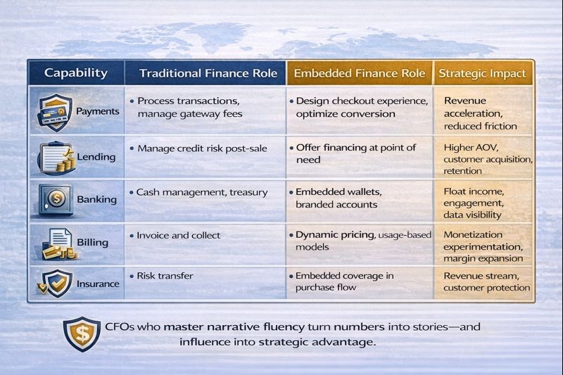 And this is changing how success is measured. In the traditional model, the CFO might be judged on margin, EBITDA, and working capital. All still essential. But in an embedded world, they are also measured on monetization efficiency, platform conversion, and partner economics. How many users adopted the embedded wallet? What is the drop-off rate on real-time financing offers? How does embedded checkout affect customer acquisition cost payback? These are not marketing metrics. They are financial architecture metrics.