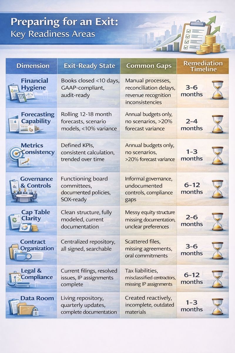 When I improved month-end close from 17 days to under six days at a cybersecurity firm, we implemented automated variance analysis, exception reporting, and comprehensive audit trails. This level of operational discipline signals to potential acquirers or public market investors that the finance function operates with rigor and precision. These are not just exit readiness items. They are how a great business runs, full stop.