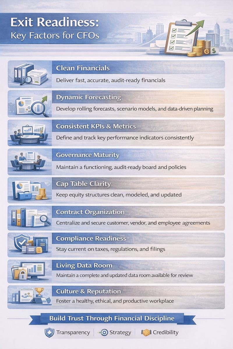 This framework provides a comprehensive checklist across eight critical dimensions that CFOs should maintain continuously rather than scrambling to prepare when an exit opportunity arises. Each dimension includes key indicators of readiness and common gaps that create friction during diligence processes.