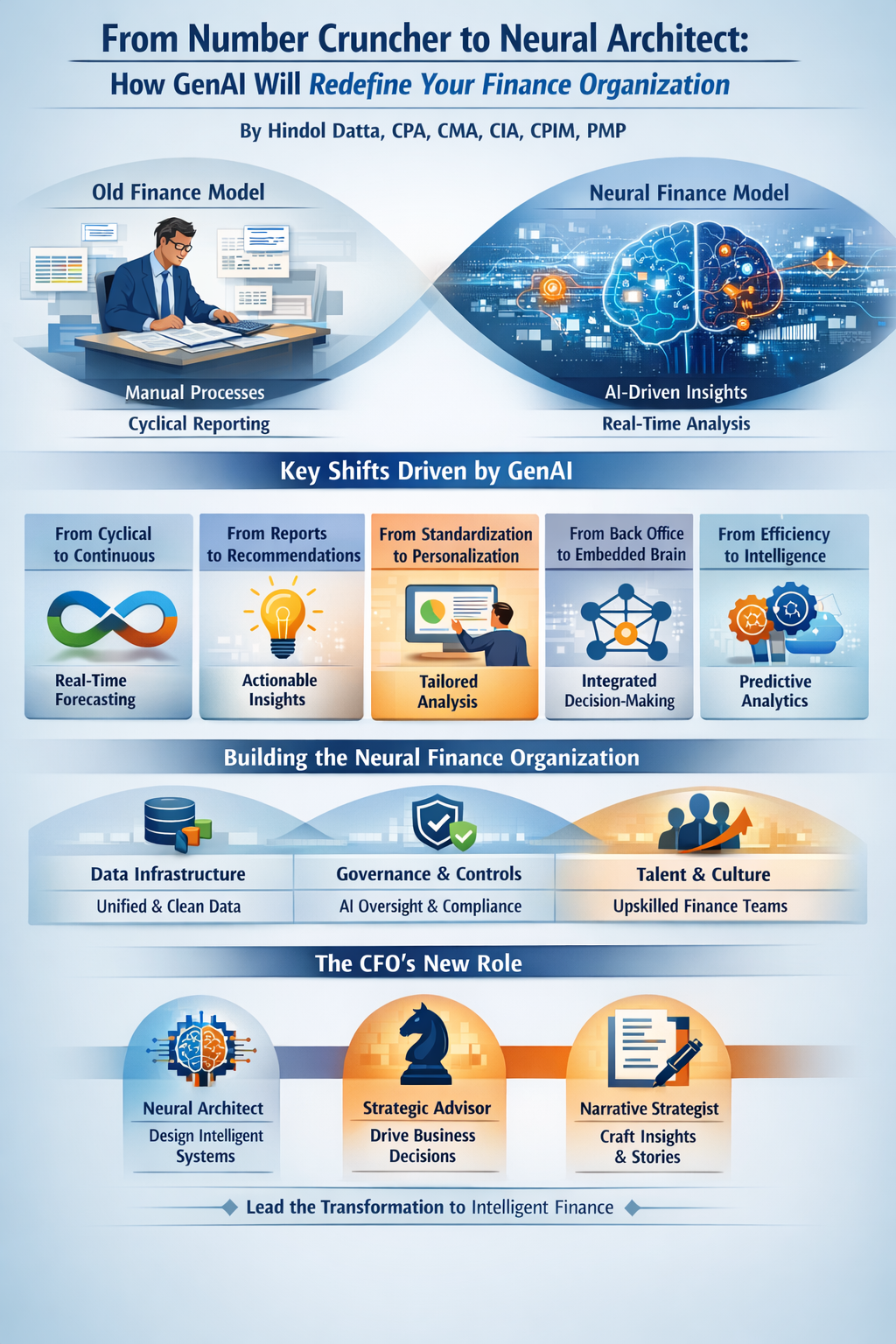 The finance organization has long been defined by precision, structure, and control. Numbers were sacred, spreadsheets were battlefields, and reporting cycles ran on fixed calendars. The finance team served as the analytical anchor, measured and methodical in its approach. That model, while durable, is showing its age. Generative intelligence is entering the finance office, and it does not follow templates, wait for quarter-end, or care for manual reconciliations. GenAI is redefining the entire architecture of modern finance organizations. What was once a department of number crunchers will soon be a neural network of insights, models, decisions, and narratives. The CFO will not just oversee accounting, planning, and capital allocation but will become a neural architect, designing systems where algorithms and analysts work side by side, where insight is continuous, and where finance is as predictive as it is precise. Throughout my twenty-five years leading finance across cybersecurity, SaaS, manufacturing, logistics, and gaming, I have witnessed multiple waves of technological transformation. From implementing NetSuite and OpenAir PSA to building enterprise KPI frameworks using MicroStrategy, Domo, and Power BI, each advancement expanded what finance could achieve. GenAI represents not merely another tool but a fundamental restructuring of how finance organizations think, operate, and create value.