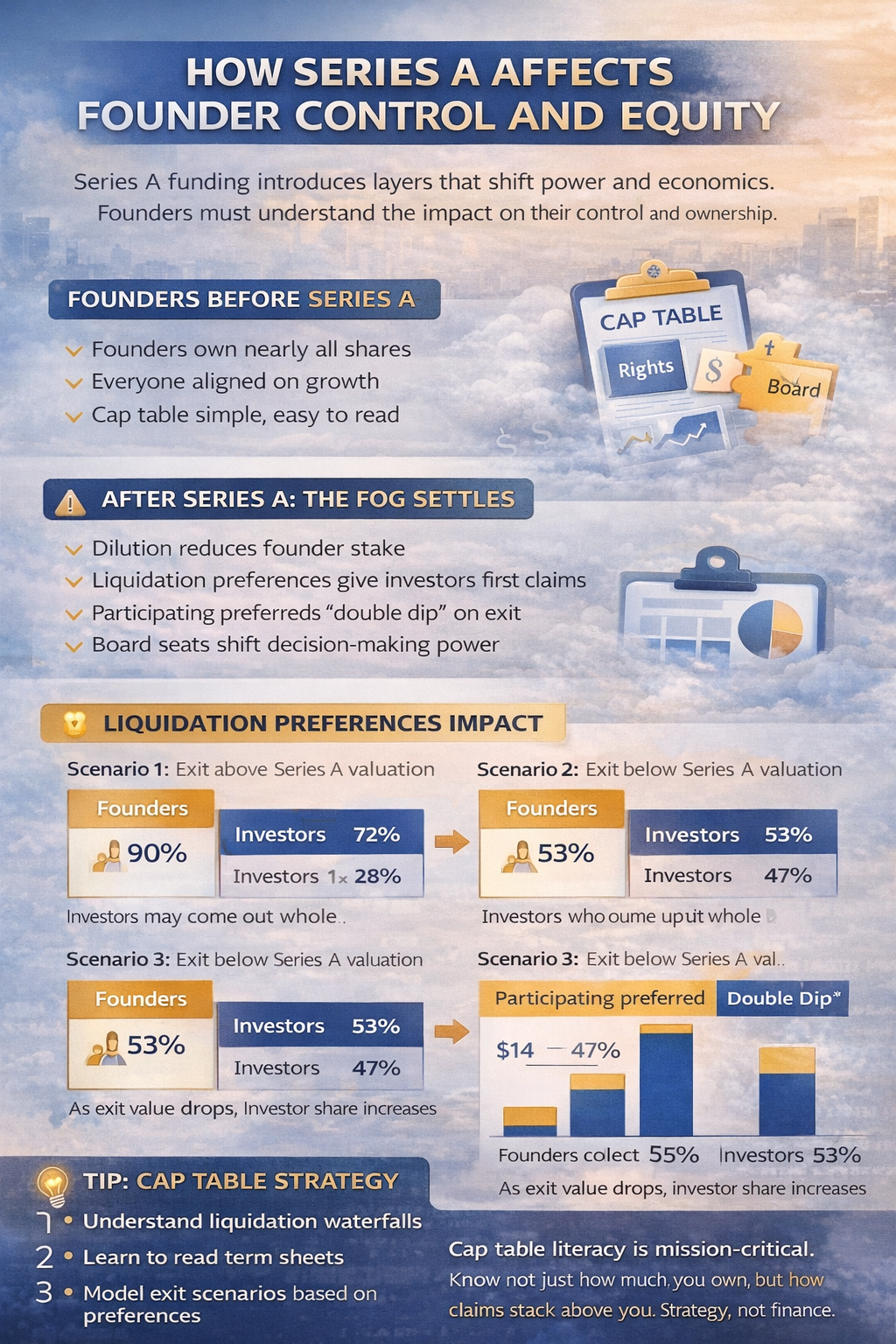 The excitement of closing a Series A round is palpable. But amid the celebration, something quieter happens. A fog settles over the cap table. Before Series A, the cap table is simple. Founders own nearly all the shares, and everyone is aligned. After Series A, investors want growth but also downside protection through rights, preferences, and board control. Liquidation preferences give investors their money back before anyone else gets paid. If the exit is below the Series A valuation, investors may come out whole while common shareholders take the loss. Then there is dilution, anti-dilution protection, participating preferred shares, board seats, protective provisions, and drag-along rights. Each layer changes how power is shared and where value flows. The fog becomes thickest when multiple rounds have occurred. Cap table literacy should be a core skill for any founder. Founders need to understand the mechanics themselves, how to read a term sheet, and how to model a liquidation waterfall. This is not finance for its own sake. It is strategy.