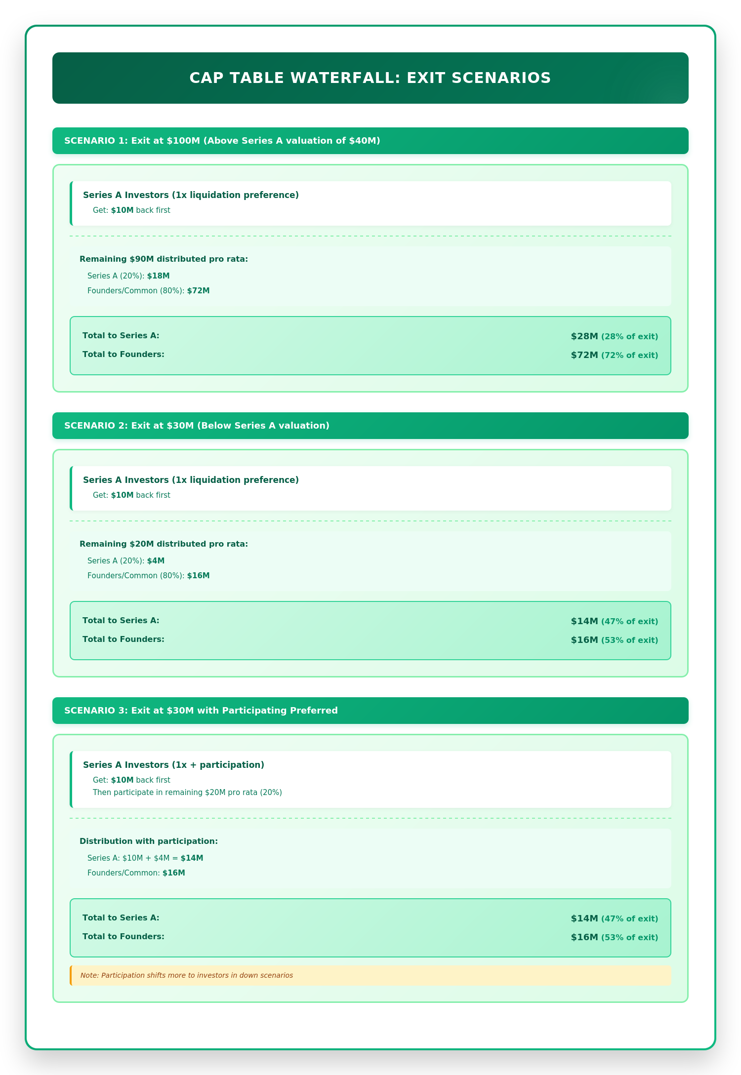 If the company sells for less than expected, the investor may still get their full money back while the founder gets little or nothing. A company can grow in revenue but decline in value. If the exit is below the Series A valuation, investors may come out whole while common shareholders take the loss. Founders often focus on percentage ownership and miss the stack of claims that stand above them.