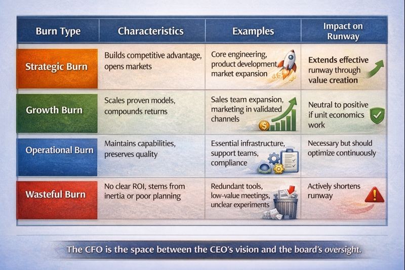 One of the smartest moves a CFO can make is to reframe burn in terms of runway-per-strategy. You do not just have 18 months of runway. You have 18 months of runway at your current burn rate pursuing your current strategy. If you pivot, pause, or accelerate, that runway changes. What this means is that burn is dynamic. It is not a fixed fuse. It is a lever. Managed properly, it can be lengthened, compressed, or repurposed to fit new conditions.
