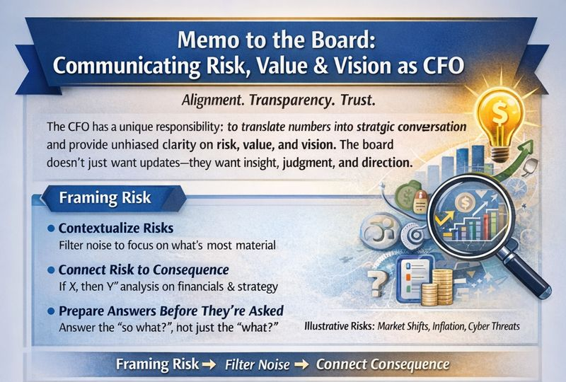 There are few moments in a CFO’s calendar as consequential as preparing a memo or briefing for the board. It is not a mere update. It is a test of alignment, a presentation of stewardship, and a declaration of what lies ahead. In those few pages or that brief presentation, the board expects not just numbers but understanding, not just performance but direction, and not just statements of risk but interpretations of what those risks mean. A well-constructed board communication is not defensive, nor overly optimistic. It is clear-eyed, analytical, and above all, rooted in judgment. The role of the CFO in board communications is unique. It is to be the translator between operations and oversight, the link between the past and the possible. The CEO paints the vision, but it is the CFO who gives it weight, explaining how it will be funded, how it will return value, and what could go wrong along the way. Throughout my twenty-five years leading finance across cybersecurity, SaaS, manufacturing, logistics, and gaming, I have learned that this burden cannot be outsourced. It is part of the trust we inherit when the title changes to Chief Financial Officer.