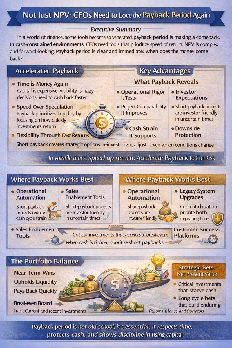 In every market cycle, tools rise and fall in favor. But the fundamentals never change. Businesses exist to turn capital into value. And the sooner that capital returns, the stronger your ability to reallocate, adapt, and grow. In tight markets, the payback period is not old-school. It is essential. It keeps the company honest. It tells you who is really adding value. And it builds a financial culture that respects time, not just theory. So let the NPV models run their course. But when you are signing that approval form, ask the question: when does the money come back? Because until it does, it is not a return. It is a bet.