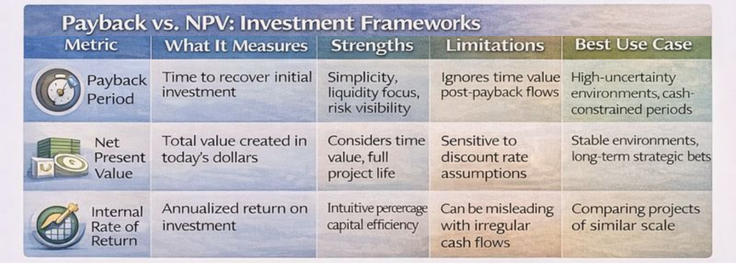 In leaner cycles, cash is king again. That means your first obligation is to protect the balance sheet, not with austerity but with clarity. And clarity starts with knowing how quickly your capital commitments return to the bank. A project that pays back in 12 months is fundamentally different than one that promises 35 percent IRR over five years but only turns positive in year four. That distinction matters when you are funding out of operating cash, not cheap debt or flush equity rounds.