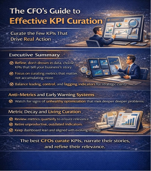 As you think about curating indicators, remember you are not trying to build a prettier dashboard. You are trying to create strategic alignment. Your job is not to measure everything. It is to shine a spotlight on what really matters so that when the pressure comes, the business knows what levers to pull and what stories to trust. In a world flooded with metrics, the rarest and most valuable act is curation. That is the CFO’s opportunity: not to count more things but to count the right things and to turn that clarity into conviction.