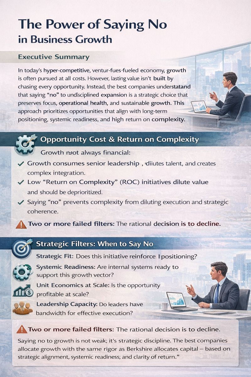 In a market addicted to momentum, saying no is a radical act. But it is one that separates durable businesses from ephemeral ones. Growth is not strategy. It is a byproduct of strategy. And when that strategy is anchored in coherence, readiness, and clarity, the organization earns the right to grow sustainably. The strategic no is not about avoiding risk. It is about avoiding regret. Because in the end, the companies that endure are not those that chase every opportunity. They are the ones that choose the right ones.
