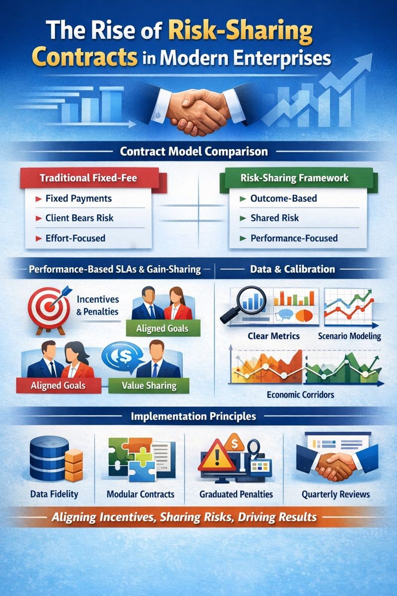In the financial architecture of a modern enterprise, few decisions bear more consequence than how revenue is contracted. The world of fixed-fee engagements is being eclipsed by shared-risk frameworks including performance-based SLAs, gain-sharing mechanisms, and penalty clauses that enable CFOs to turn contracts from rigid commitments into dynamic instruments of alignment. The move toward risk-sharing stems from realizing that in a volatile world, static pricing fails to reflect service delivery reality. Traditional contracts assume scope, inputs, and outcomes are knowable at inception, but assumptions underpinning forecasts are now routinely invalidated within months. Well-structured risk-sharing contracts balance predictability with adaptability, creating symbiotic feedback loops between client objectives and provider behavior. However, risk-sharing requires greater precision, demanding clear baselines, correct measurement of causality, and shared understanding of success through data design, scenario analytics, and economic corridors defining acceptable variation.