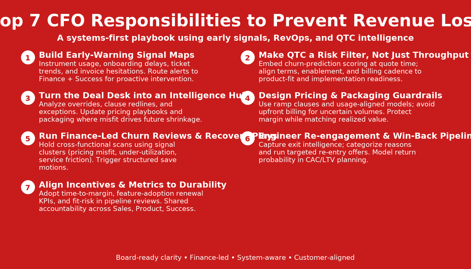 The first shift involves accountability. Most companies assign churn management to Customer Success. But revenue loss is a system-wide outcome. It results from poor qualification, misaligned pricing, inadequate onboarding, or unmeasured support load. Therefore, recovery must be equally systemic. It must begin with finance, not because finance can stop churn, but because finance holds the signal map, comprising markers such as renewal cohorts, contract performance, margin impact, and downgrade velocity. I have used this vantage point to elevate churn not as a downstream KPI, but as a leading indicator of GTM misfit.