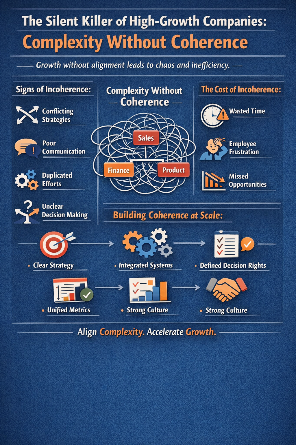 Every high-growth company will face complexity. It is the price of ambition. But coherence is a choice, a discipline of clarity in the face of chaos. Companies that scale well do not avoid complexity. They organize it. The silent killer is not how much you are doing but how little it connects. Coherence is the difference between momentum and entropy, between scaling up and falling apart.