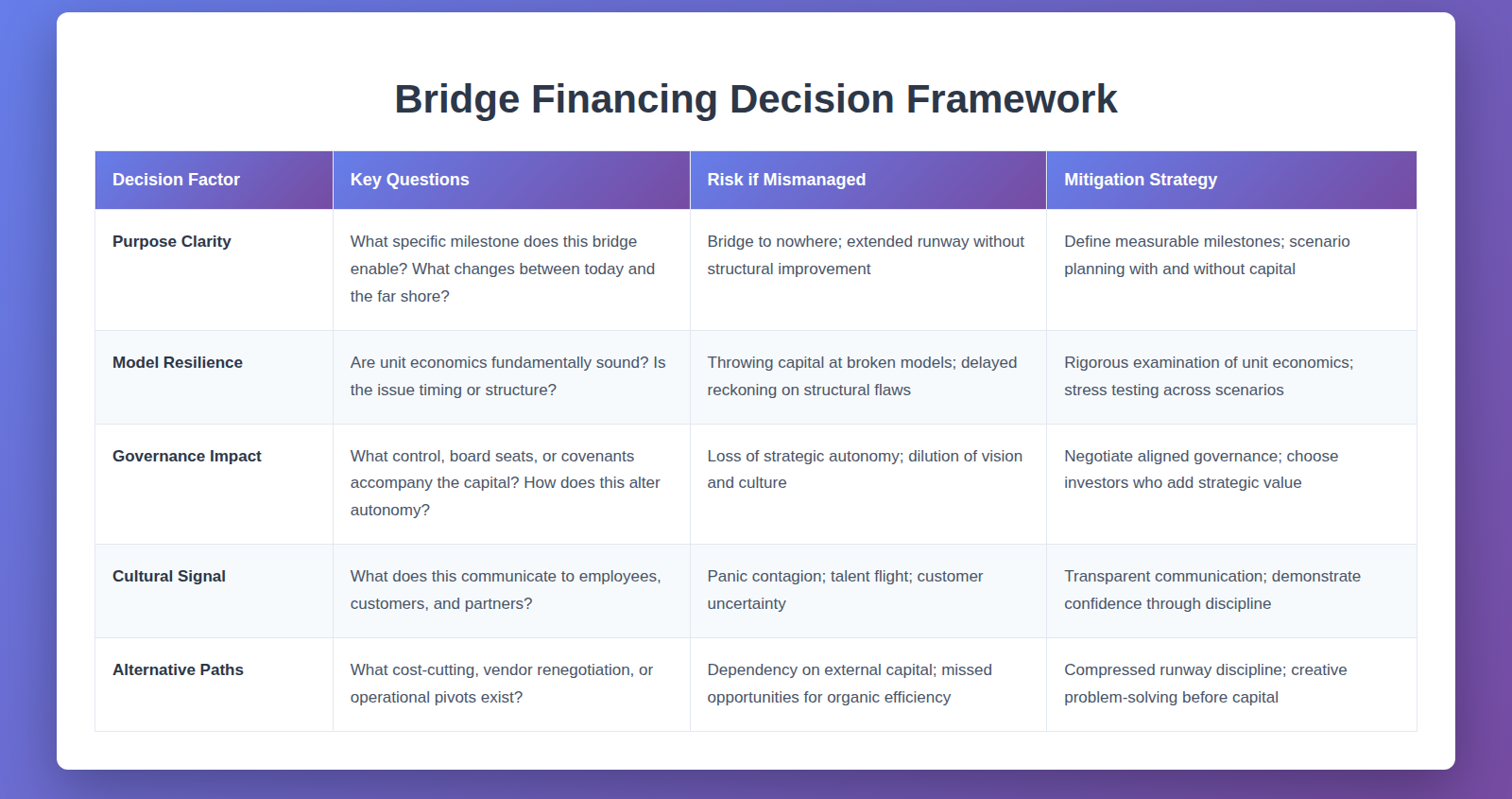 They conducted stress tests revealing that growth without profitability would burn through cash in sixty days. The bridge would create a one hundred eighty-day runway but would not fix margins.