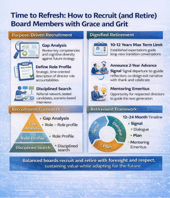 Recruitment and retirement are not opposite acts. They are part of the same discipline: sustaining board value over time. Great boards do this with grace, treating people with dignity, honoring legacy, and ensuring exits do not leave wounds. And they do it with grit, confronting underperformance, resisting the comfort of familiarity, and facing the realities of competitive pace. The board’s job is not to stay together. It is to stay relevant. That requires renewal. Done with intent. Done with care. Done without drama. That is the standard.