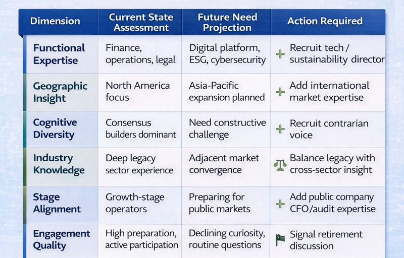 When I led board reporting at a gaming enterprise where I oversaw $100 million in acquisitions and post-merger integration, we conducted a board composition review that identified gaps in digital platform expertise and international market experience. Rather than recruiting based on credentials alone, we created role profiles that specified the strategic questions new directors needed to ask: how do we monetize cross-platform engagement, what regulatory risks exist in our target Asian markets, how should we structure partnerships versus acquisitions. This purpose-driven approach resulted in board members who immediately contributed to strategic decisions rather than requiring years to find their voice.
