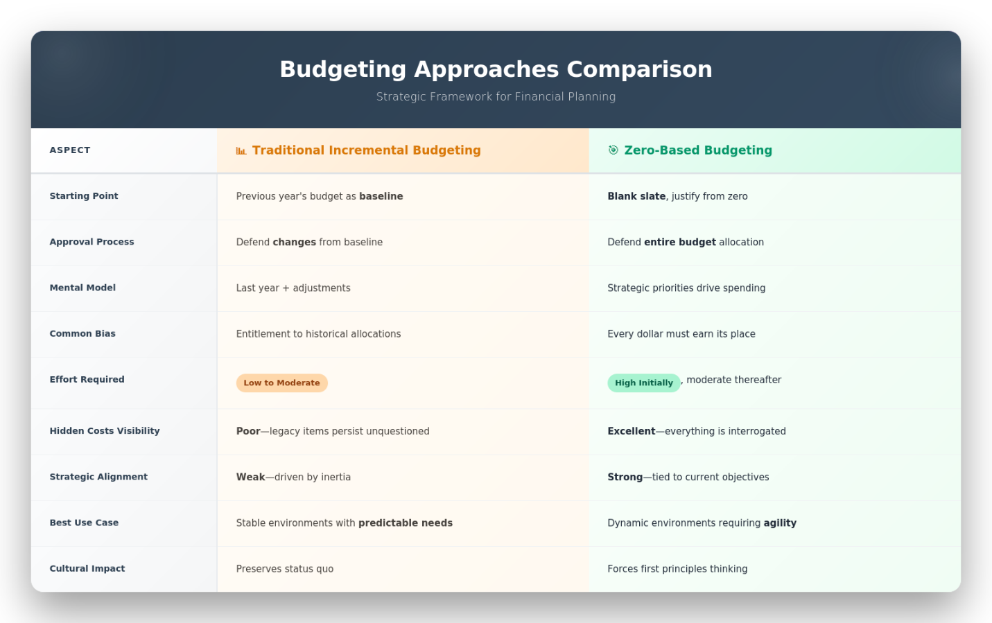 Zero-Based Budgeting represents a fundamental shift from incremental thinking to first principles resource allocation. When implemented with clear strategic direction, it transforms budgeting from ceremonial exercise into strategic capability. Organizations that master ZBA continuously realign resources to strategic priorities, building organizational muscle for evidence-based decision-making. In an era of discontinuous change, the discipline of justifying every dollar anew is not austerity but wisdom, ensuring capital flows to its highest and best use rather than to the loudest voice or longest tenure.