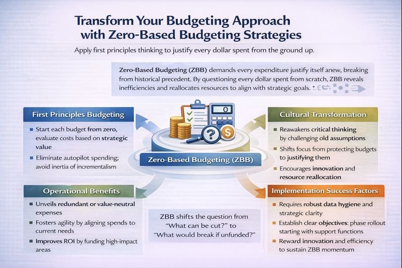Zero-Based Budgeting requires every line item to earn its keep irrespective of historical precedent. This is not merely a budgeting technique but a rethinking apparatus. Having managed financial planning while implementing systems and reducing monthly burn from $800K to $200K through disciplined resource allocation, I have witnessed how every dollar spent must be justified anew as if the enterprise were starting from scratch.