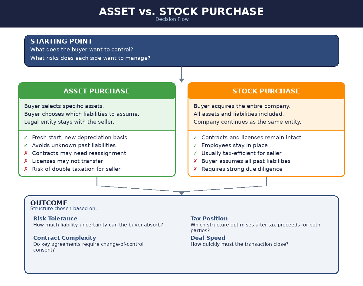 This diagram illustrates how the decision between asset and stock purchase flows from the buyer’s objectives and risk appetite. Each path carries distinct advantages and trade-offs across taxes, contracts, licenses, and employees. The structure chosen ultimately reflects the balance each side strikes between control, speed, and financial efficiency.